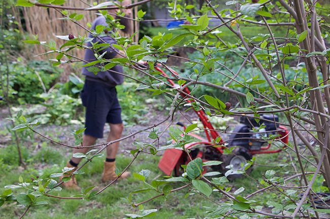| Joe selected a more traditional tiller, a Pony 250cc forward rotating rear-tine rototiller. It’s always been his preferred model. |